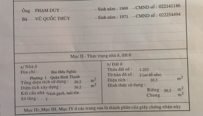 Bán nhà đường Bùi Hữu Nghĩa , phường 1 , Bình Thạnh ; Dt 30,2m2 , 1 trệt, 1 lầu ; Diện tích sàn xây dựng 60,4m2 . Giá 1,3 tỷ