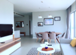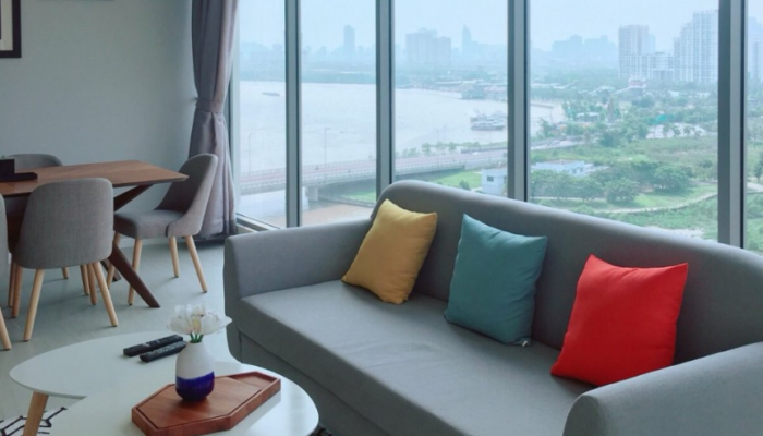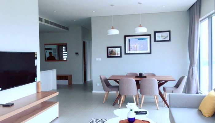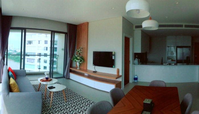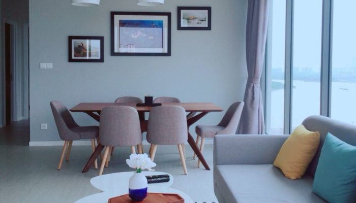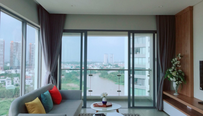 Căn hộ 117 m2 được thiết kế gồm: phòng khách + balcony rộng lớn cộng với cửa kính kéo dài từ sàn đến trần giúp người nhìn có thể nhìn toàn cảnh sông Saigon, KDT Thủ Thiêm và trung tâm Quận 1. Phòng ăn với bàn ăn 6 ghế. Khu vực bếp với đầy đủ các trang thiết bị như: tủ bếp trên dưới, bếp nấu điện, máy rửa chén, lò nướng, máy hút mùi, tủ lạnh side by side. Khu vực giặt phơi với máy giặt cửa ngang, máy sấy. 3PN đã được trang bị tủ âm tường, bàn trang điểm tại phòng master, giường nệm. 2WC với trang thiết bị vệ sinh nhập khẩ từ Đức.